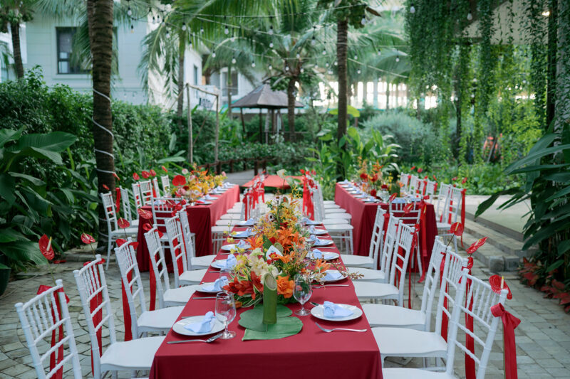 Le Palmier tự hào mang đến những xu hướng trang trí tiệc cưới được yêu thích nhất với sắc đỏ quý tộc phủ lên không gian một lớp ánh sáng huyền bí, tôn vinh tình yêu nồng nàn và vẻ kiêu sa đầy mê hoặc của cặp đôi.